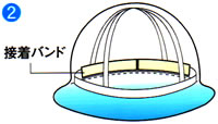 ステップ2. 接着バンドのはくり紙をはがしヘルメットの内側の額部分に貼ってください。 ※接着面のほこり・水分は、よく拭きとってから押さえるように貼り付けてください。 |